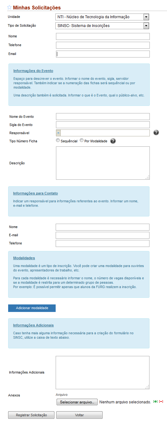 Para que uma inscrição no SINSC ser viabilizada, é necessário que o pedido seja realizado com 10 dias de antecedência ao início das inscrições. Para realizar a solicitação: